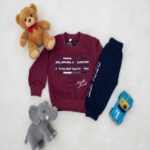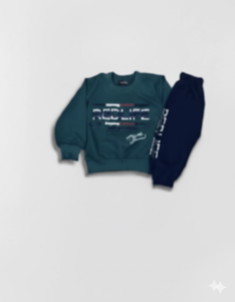 - Bottom Details: Paired with navy blue style trousers. These joggers include a large, repeated graphic print or text detailing running down the side of one leg, adding an athletic and trendy touch. The trousers have an elasticated waistband for maximum comfort.
