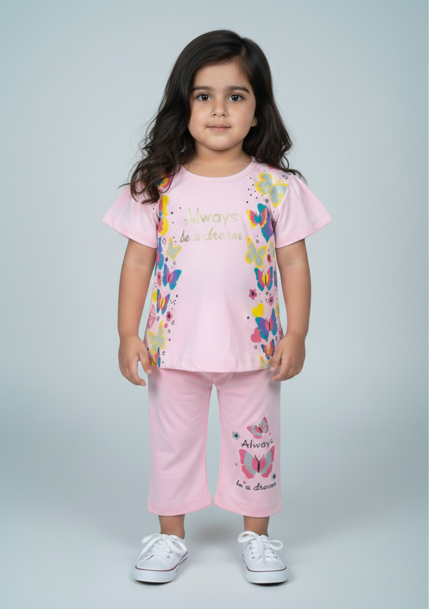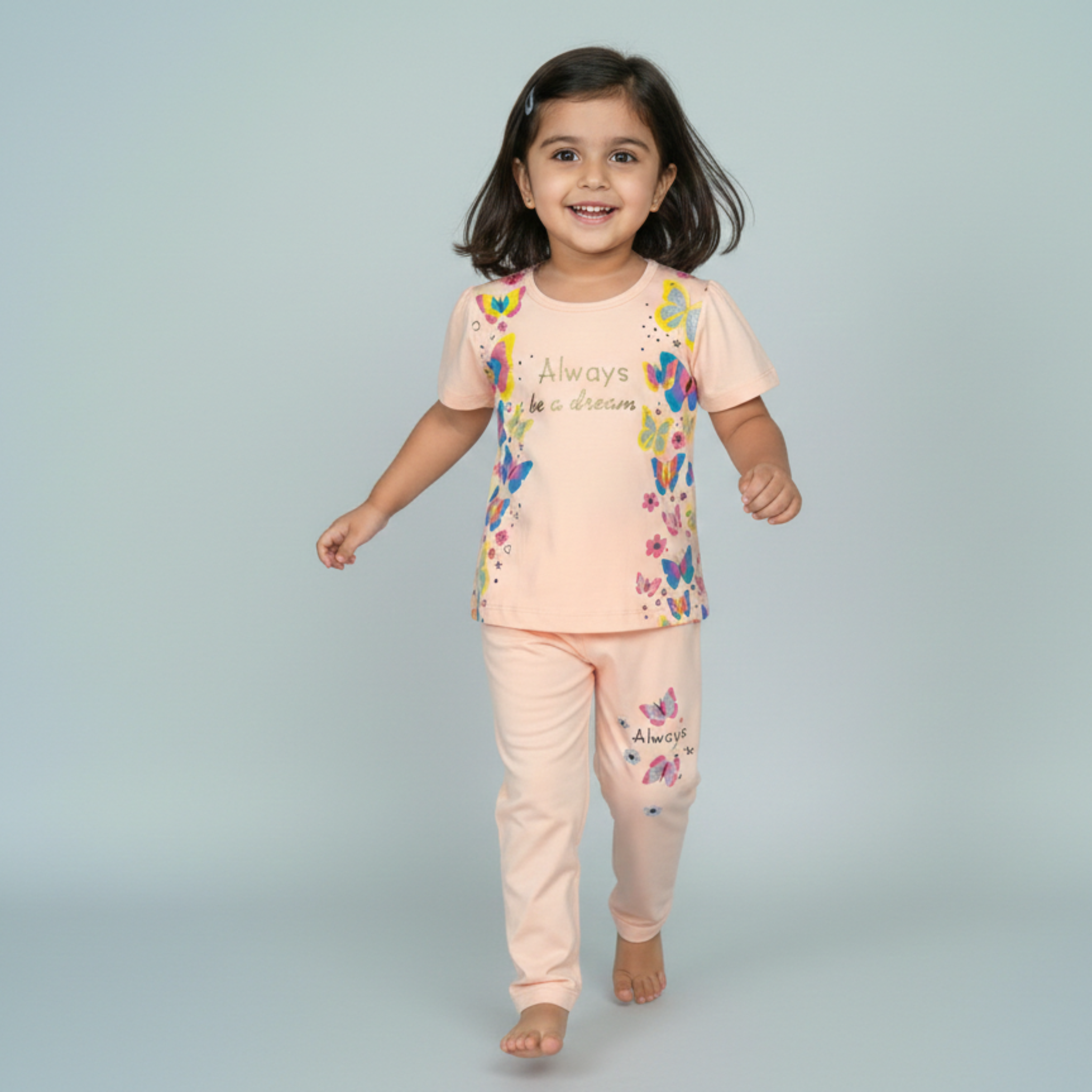 Design & Graphics: The peach-toned t-shirt is adorned with colorful butterfly motifs in shades of blue, yellow, and pink along both sides. The center features a glittery “Always be a dream” inspirational quote.