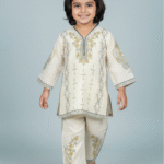 Celebrate the season in style with our signature 2-Piece Embroidered Collection. This set is built on a timeless Cream/Ivory base, known for its versatility and elegance. The tunic (shirt) features a flattering V-neckline adorned with a built-in, multi-strand faux pearl necklace and delicate silver-toned jhumka (tassel) embellishments, eliminating the need for extra jewelry.
