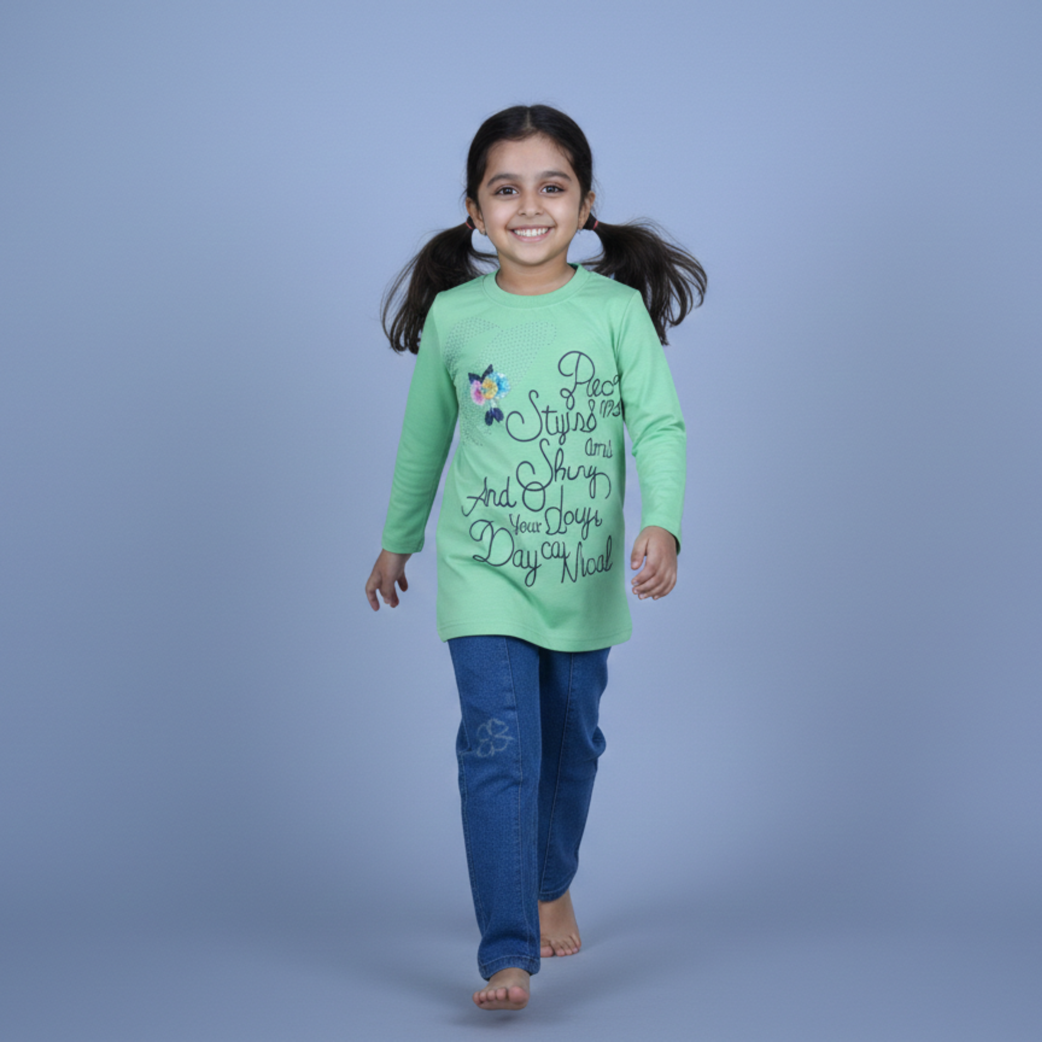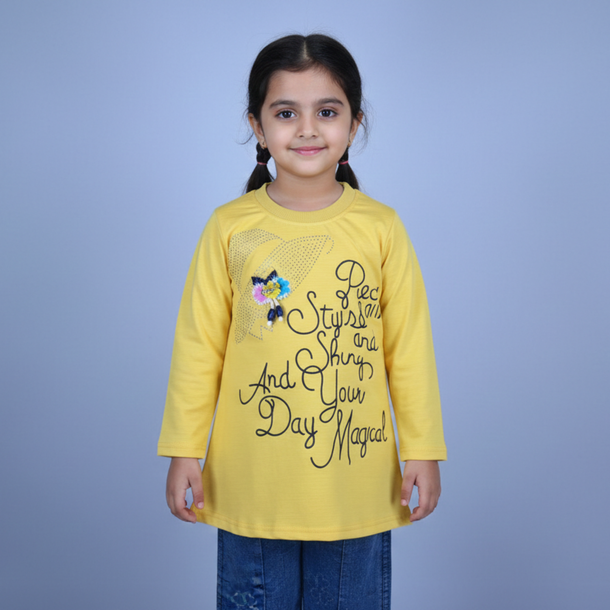 Coordinated Denim: Includes full-length denim-style pants with a flexible fit. The pants feature a subtle embroidered flower on the leg to perfectly match the theme of the top.