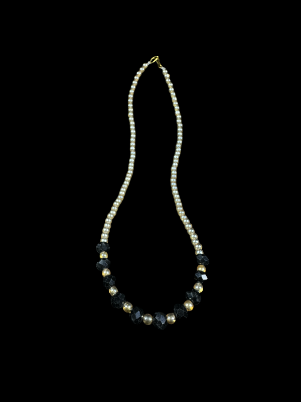 This stylish necklace features a classic combination of cream-white pearls and faceted black beads. The top half is made of smooth, elegant pearls, leading down to a bold center section where large black beads alternate with smaller gold-toned accents.