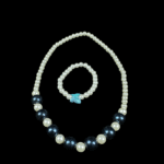 Necklace Design: The necklace features a gradient of shimmering cream-colored pearls accented by large, polished dark blue beads.